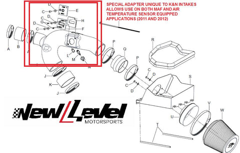 Unique MAF/Air Temp Sensor fitting accommodates both 2011 and 2012-2014 models! K&N 57 Series Gen II Air Intake Kits (FIPK's) are built for many different vehicles and represent a dramatic improvement over a K&N O/E replacement filter alone; they use only non-metallic rotationally molded tubes that can reduce air temperature and decrease intake sound over a metal tube. Restriction can exist BETWEEN an air filter and the engine reducing the benefit of a K&N Air Filter. The weakest link in the airflow chain robs a vehicle of its natural horsepower. Often that weak point is the factory air path leading to the Engine. K&N Air Intake Kits virtually eliminate air path restriction by replacing the air filter and the entire air path to the engine. The aerodynamically engineered tube drives a massive amount of air into an engine, which translates into POWER.