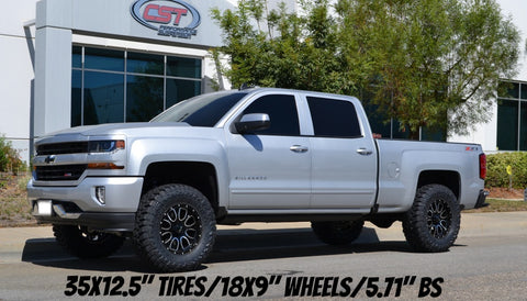 The design of this 4.5 kit allows it to be used on all three O.E. suspension configurations; cast-steel, aluminum or stamped steel. If you're looking for a performance lift for of your truck, but want it to still be able to be a daily driver, you've found the right kit. This CST Suspension lift kit drops the lower control arms down using high clearance crossmembers that follow flush in to the factory x-member for improved ground clearance. Next CST drops the upper control arms down using boxed & gusseted drop brackets. The front portion of the kit includes laser cut coil-over extensions, boxed differential and sway-bar drop brackets. All necessary installation hardware is included. This 4.5 kit also includes an aluminum skid-plate to connect the front and rear CST LCA cross-members and protect the front differential. 3" lift blocks and new u-bolts take care of the rear. The end result is a level stance since these trucks sit lower in the front from the factory. This system will not cause your Stabillitrak to malfunction. If you're worried about ride quality, don't be. Your truck will maintain its ride quality after being lifted with this kit. You'll also be able to fit up to a 35" wheels 9" wide wheels. The part number for this item is CSK-C3-19-1 and it fits 2014-2018 Chevy Silverado and GMC Sierra 1500 4WD models. This kit will NOT work on a 2WD model. You will need to upgrade your rear shocks with installation of this kit. You can use the CST Shocks (available above for an extra charge), or you can use another brand of your preference.
