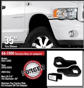 If you're looking for a mild lift to level out the front of your truck, you've come to the right place! Ready Lift leveling kits are an easy solution that are reliable, safe to use, and best of all, maintain factory ride quality, quaranteed. This ReadyLift front leveling kit achieves lift for your truck with a new set of forged torsion keys. Unlike some others, Ready Lift Torsion Keys are designed to grab the FLAT of the torsion bar for a tighter, more secure fit. CNC machined adjustment bolt pockets and superior hardware allow for proper bolt seating, ensuring accurate and safe adjustment. being forged, ReadyLift Torsion keys are over 25% stronger than OEM components, and guaranteed to never break or fail. Your ReadyLift front leveling / lift kit will come with everything you need for a quick and easy installation. All necessary hardware, as well as detailed instructions that include photos, and a Lifetime Warranty are included. The part number for this Ready Lift front lift kit is 66-1000 and it fits 2002-2005 Dodge Ram 1500 4WD models. It lifts the front of your truck up to 2" (the amount of lift is adjustable), giving your truck a level stance and allowing you to safely run up to a 35" wheel.