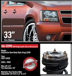 If you're looking for a mild lift to make just the front your SUV a little meaner and a little taller, you've come to the right place! Ready Lift front leveling / lift kits are an easy solution that easy to install, safe to use, and best of all, they maintain factory ride quality. guaranteed. This ReadyLift lift kit achieves lift for your truck with strut extenders/spacers. This simple solution means you won't have to compress your springs, and you can probably to the installation yourself in your own garage. Your ReadyLift lift kit will come with everything you need for a quick and easy installation. All necessary hardware, as well as detailed instructions that include photos, and a Lifetime Warranty are included. The part number for this Ready Lift complete lift kit is 66-3010 and it fits 2007-2011 Chevy Avalanche (all 6 Lug) models. It lifts the front of your truck 1.5, allowing you to safely run up to 32" wheels.