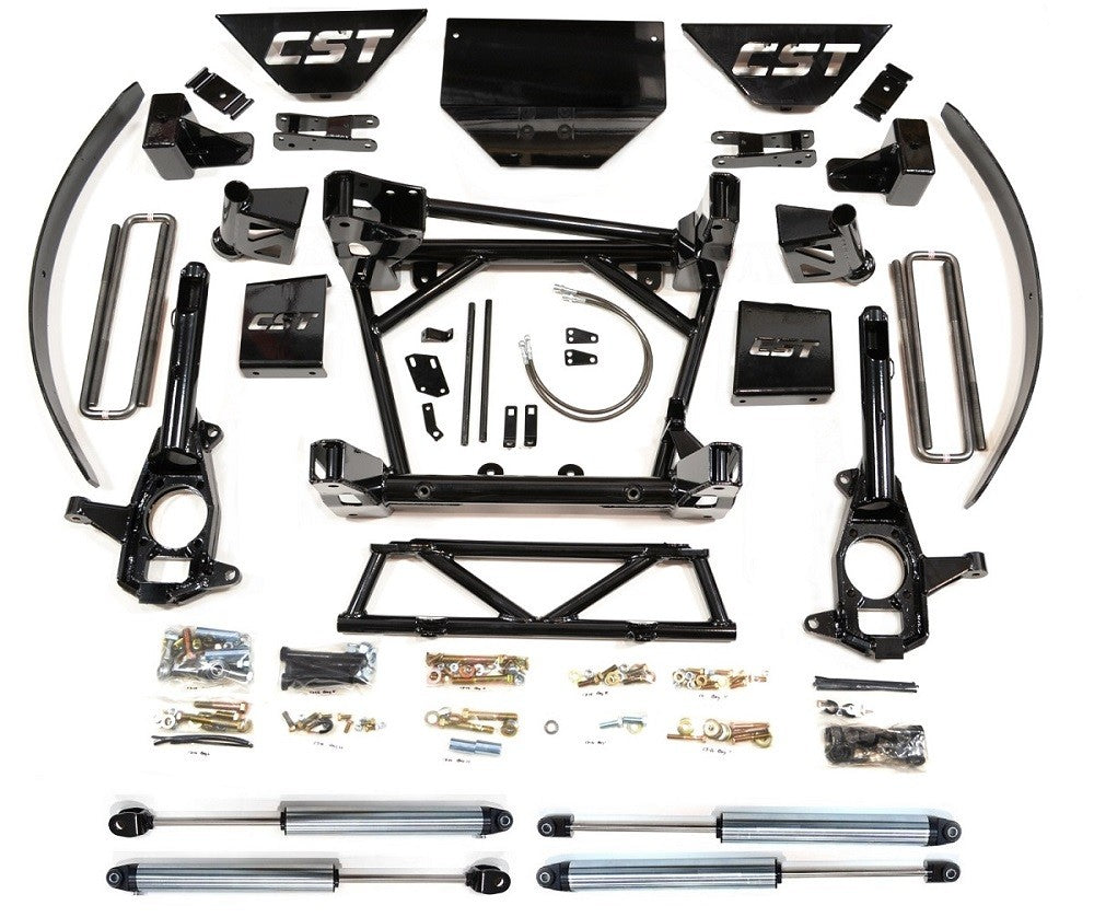 If you're looking for a massive performance lift for your truck, but want it to still be able to be a daily driver, you've found the right kit. You'll also be able to run much larger tires and wheels (see wheel size tab for more info on commonly used wheel and tire sizes. The 8-10" kit (you will need to add torsion keys part CSK-C13-3 to go from the fixed 8" up to 10" in the front) includes a 1 piece gusseted sub-frame w/ steel full size differential skid plate, fabricated steel / CNC machined front steering knuckles, high strength steering drop center link w/ heim jointed support links to minimize wear of factory idler and pitman arms, differential drop brackets, heavy duty bump stop brackets, extended sway bar end links, brake line drop brackets, CST laser cut torsion drop brackets, and all necessary hardware. Steering stabilizer brackets are built into the kit and CST's stabilizer shock kit CSR-2946 can be purchased as an option. To lift the rear of the truck, this CST Lift Kit includes a an entirely new leaf spring pack. Also included are new u-bolt spring plates, 1 inch rear blocks and zinc plated u-bolts for 7.5 inches of rear lift. 4 CST 2.0 Series Emulsion Shocks are included with this kit. No cutting of the front differential is required or welding of any kind. CST's 8-10" lift kit retains the factory front wheel track width and has zero compatibility issues with the GM Stabilitrak system. The part number for this item is CSK-C3-16-2 and it fits 2011-2016 Chevy Silverado, GMC Sierra (2500HD 3500HD Models). 2015-2017 4WD models should also purchase CST front driveshaft part number CSP-C28-1 (11-16 Models) or CSP-C28-7 (17 Models) Alternate part numbers: CSK-C3-16-5 css-c3-16-5 csk-c3-16