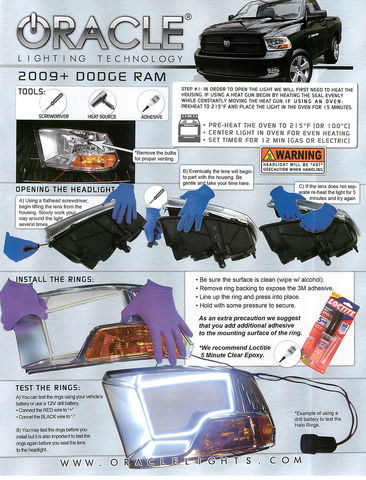LED Halo Kits by Oracle Lighting are taking the automotive aftermarket by storm. Installing LED Halo Lights inside your headlights will instantly change the entire appearance of your vehicle, especially at night. Oracle LED Halo Kits use a rigid PCB covered in leds, meaning the halo rings will not break and the light shines directionally forward. The halo rings have an industrial grade self adhesive backing, so they easily install inside your headlight (once you complete the much more difficult process of opening your headlight assembly). Oracle Halo rings can be wired to a switch for manual control or wired to your parking lights for automatic operation. Approx. 100,000 hour lifetime. Professional installation is recommended. If planning to install these yourself, please watch the install video to make sure you are comfortable with the process of baking and opening your headlight before purchasing. Some colors may not be legal in certain cities/jurisdictions. Check with local law enforcement before purchasing if purchasing a color other than white or amber. This LED Halo Light Kit fits 2009-2016 Dodge Ram (Does NOT Fit Quad Sport) models and comes with the halo rings to install inside of both headlights. Foglight halos are not included and are sold separately. White 2251-001 Blue 2251-002 Red 2251-003