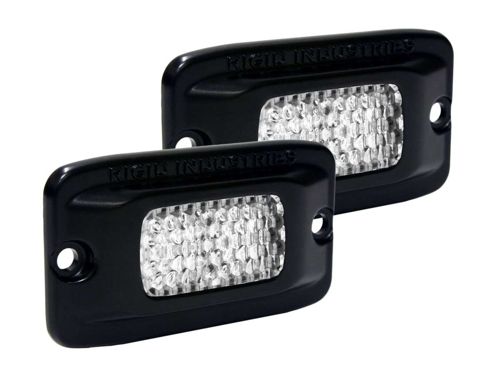 The SR-M Flush Mount Back Up Light Kit by Rigid Industries includes everything you need to install a pair of Rigid Industries back-up lights on your vehicle: Two Rigid Industries LED lights, a 25' wiring harness hardware and black covers. This kit features the Rigid patented Hybrid optics system combined with a Diffused lens to offer a powerful 60 degree beam pattern for unmatched visibility. The part number for this item is Rigid 980013