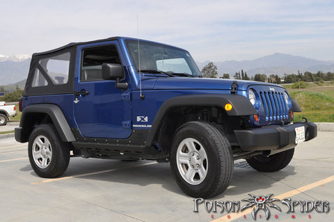 2007-2016 Jeep Wrangler (2 Door Models) Brawler Rockers Steel w/ Black SpyderShell Rocker Armor by Poison Spyder Customs Jeep JK's, are extremely vulnerable to rocker armor damage on the trail. Poison Spyder Brawler Rockers provide the ultimate rocker armor protection while actually enhancing your Jeep's off-road capability—not to mention they look bad-ass! This item features Poison Spyder SpyderShell coating, which is a 6 step black coating that includes the state of the art in preparation, application, materials and packaging to ensure that your SpyderShell products stay looking great for years. Brawler Rockers are two-piece "mini-boatside" style rocker armor. Each component is fabricated entirely of CNC-laser cut, precision brake-formed 3/16" plate steel. The upper piece fits the lower section of your Jeep's exterior sheetmetal like a glove, conforming to the sublte curvature of the JK and providing protection similar to Poison Spyder's JK Body Armor. The lower piece incorporates an extremely strong rub rail that protrudes about 3¼" outboard of the Jeep's body tub. The top surface of the rub rail may also serve as an entry step. Below, the brake-formed 3/16" plate steel angles down and inward to form a high clearance boatside for sliding off of rocks and obstacles. Inside, an array of beefy 3/16" thick internal gussets provide ultimate strength to the Brawler Rocker. Oval lightning holes along the length of the boatside section provide great Poison Spyder looks while allowing access to hose out mud and debris after a day on the trail. The ends of the Brawler Rockers are capped in the same 3/16" plate steel, in angled facets that allow up to a 40" tire and visually integrate with the lines of Poison Spyder front and rear JK Crusher Flares. The upper piece attaches to the body tube using supplied stainless steel flat-head cap screws and nut-serts. The lower piece attaches to the upper piece also with stainless steel flat-head cap screws and easy-to-install clip-nuts. All fastener holes are countersunk for a flat surface using the flat-head hardware. Underneath, the lower piece attaches at the Jeep's body mounts. Attaching the Brawler Rockers in this way, along several different planes, provides triangulated strength to the entire assembly. The body-mount tie-ins ensure that they are securely integrated to the strongest structural component of the Jeep—the frame—while also allowing the Brawler Rocker to hug the body tub as closely as possible. Please note that Brawler Rockers are NOT compatible with body lifts. Brawler Rockers are designed to handle a serious beating! They not only provide unmatched rocker protection, but they also provide a super strong pivot point which can help you to maneuver through tight obstacles. The boatside design will allow the Jeep to slide off of rocks and back onto the center of the trail. The protruding rub rail keeps vertical obstructions such as trees and rock walls a safe distance from the Jeep's doors and other vulnerable body parts. And when you need to change a tire or perform an extraction, the Brawler Rocker provides a strong, convenient lifting point for your Hi-Lift jack. The part number for this item is Poison Spyder 17-08-200p1 and it fits 2007-2016 Jeep Wrangler (2 Door Models). Please note that Brawler Rockers are NOT compatible with body lifts.