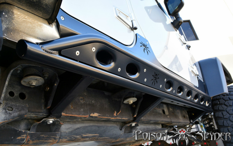 2007-2016 Jeep Wrangler (4 Door Models) Frame Mounted Rocker Knockers Rocker Armor by Poison Spyder Customs The most vulnerable areas on the body of the Jeep JK are the rocker panels. Poison Spyder Rocker Knockers protect your JK's rocker panel area while enabling you to slide over rocks and obstacles. Rocker Knockers enhance your Jeep's trail performance while adding rugged off-road looks to your JK. These Frame-Mounted Rocker Knockers are identical to our Body-Mounted version, except in how they mount. Which one is best for you will depend on how you intend to use your Jeep! DOM Tube Construction The tubular rocker rail is rugged 1.75" X .120 wall DOM structural tubing. The slider rail is fabricated from CNC-bent 1.5" X .120 wall DOM tubing. The space between the Slider and the main tube of the Rocker Knocker is filled with a 3/16" thick CNC laser-cut steel base plate for the removable slider skid. The slider and skid mount at an angle to the main tube of the Rocker Knocker to provide boatside-like protection from the rocks while keeping the Jeep's doors and body a safe distance from higher level trail hazards. Removable Slider Skid The removable slider skid features Poison Spyder's exclusive oval dimples for structural strength as well as great Poison Spyder looks. The Skid attaches with countersunk stainless steel flat head cap screws for a flush surface. The outer skid is made of 1/8" steel and is secured to a 3/16" base plate welded into the slider hoop assembly. The Slider does not rely on the skid for structure. The advantage of having the ability to remove the skid, is to allow you to replace it if it becomes damaged to a level that it has lost its aesthetic appearance or functionality. Also you will be able to customize the Slider's color to match your Jeep's body color, or any color you choose. Frame-Mounted Outriggers Frame-Mounted Rocker Knockers attach to your Jeep's frame rails through three rugged, precision engineered outriggers on each side. The outriggers are fabricated of CNC laser cut 3/16" thick plate steel, and are designed in a triangular shape to act as their own gusset and provide superior strength. The outrigger wraps around the bottom and side of the frame rail for support on two planes. The outriggers are also located so they may be directly bolted to the sides of the Jeep's body mounts for even more strength. Compare this design to competitors' frame-mounted sliders that use a simple piece of non-triangulated, non-gusseted tubing welded to a plate that attaches to the side of the Jeep's frame rail. Bolt-On or Weld-On installation Instructions and hardware are provided for a fairly easy bolt-on installation of the Frame-Mounted Rocker Knockers. The procedure uses some existing mounting holes on your Jeep's frame, but does require some additional drilling and tapping. Alternatively, installers may choose to weld the Rocker Knockers in place. Please note, however, that reaching the nuts on the back-side of the slider plate for installation of the removable skid will be more difficult with the Rocker Knockers already in place. We recommend testing the skid removal process with the Rocker Knockers bolted into place, before permanently welding them on. Suspension & Body Lift Compatibility Frame-Mounted JK Rocker Knockers are not compatible with typical "long arm" suspension kits, without some Do-It-Yourself modifications. The rearward support outrigger will likely interfere with the location of most long-arm kit's link brackets. The part number for this item is Poison Spyder 18-08-030 and it fits 2007-2016 Jeep Wrangler (4 Door Models).