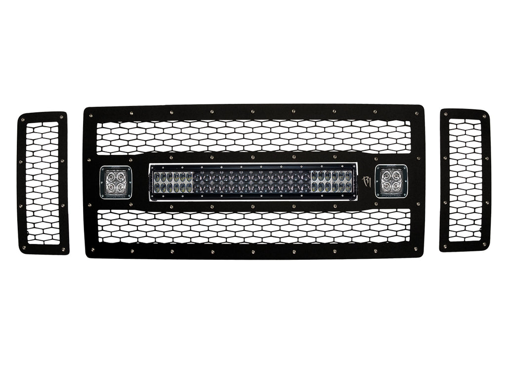 This Rigid Industries replacement grille is designed specifically for the 2008-2010 Ford F-250 / F-350 Super Duty and allows for a clean, OE-quality install of a Rigid Industries high output LED Light bar. This grille accepts one (1) 20" E-Series LED light bar (not included). and (2) D- Series LED Lights (not included) This multi piece grille is made from laser-cut 304 stainless steel and is assembled using stainless steel button socket head bolts and nyloc nuts - no welds. It features a high quality black powder-coat finish. Installation requires modification to your OEM grille shell. Professional installation is recommended. The part number for this item is Rigid Industries 40567 and it fits 2008-2010 Ford F250 F350 SuperDuty FX4 4WD Only models.