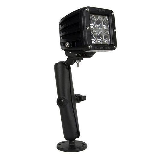 LED Lights are NOT included and are sold SEPARATELY. This mount features a 2.5" diameter round base with 7 bolt holes. The base holds a 1" diameter ball which connects to a 6" long arm. At the end of the arm is another 1" diameter ball which connects to a small light mounting tab. Great for permanently mounting a SRM, SRQ or D-Series light on a flat surface with maximum adjustability.