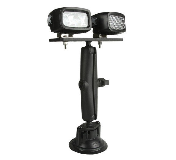 LED Lights are NOT included and are sold SEPARATELY. This mount features a 3.25" diameter twist-lock suction cup base. The base holds a 1" diameter ball which connects to a 6" long arm. At the end of the arm is another 1" diameter ball which connects to a 6.25"x2" mounting plate. Great for temporarily mounting multiple SRM, SRQ or D-Series lights on a flat surface with maximum adjustability.