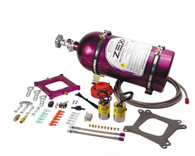 Revolutionary perimeter injection technology design provides better nitrous and fuel atomization! For years, plate systems have been just that; a plate bolted under the carburetor equipped with two crude brass spray bars to inject nitrous and fuel into the intake charge. Nitrous technology is getting ready to take a huge leap forward! The new ZEX Perimeter Plate nitrous system provides the optimum spray efficiency with nitrous and fuel outlets placed at 12 injection points around the perimeter of the intake manifold. This new system provides perfect distribution of nitrous oxide and fuel, delivering the most horsepower possible. Through an ingenious new design, nitrous is injected into and through the ZEX plate creating a highly combustible nitrous and fuel cloud in the plenum of the manifold. This even distribution avoids the irregular fuel burn problems and leakage found with spray bar systems, which results in lost power. The new ZEX Perimeter Plate nitrous system is tunable for a 100 to 300 horsepower boost and is compatible with any square flange, four-barrel carburetor application.