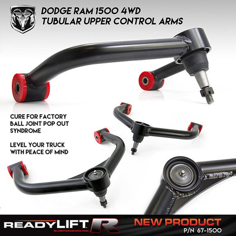 Ready Lift Upper Control Arm Kits are available for the consumer who wants to beef up their front suspension and correct the well known and despised factory ball joint pop out issue on Dodge Ram trucks. Ready Lift Upper Control Arms are 100% bolt on without any additional modifications. Great for all trucks, whether stock, leveled, or lifted. ReadyLift Upper Control Arms feature tough urethane bushings and proprietary ball joints that offer the performance you want and need from your truck. Sold as a pair, Ready Lift Upper Control Arm Kits significantly outperform the factory control arms and are much stronger, a big plus for lifted and/or leveled trucks, especially those running larger wheels. We guarantee the lowest price on Ready Lift suspension leveling kits and lift kits. If you see it lower somewhere else, well match or beat that price! The part number for this PAIR of upper control arms is 67-1500 and they fit 2006-2018 Dodge Ram 1500 (4WD Models) models.