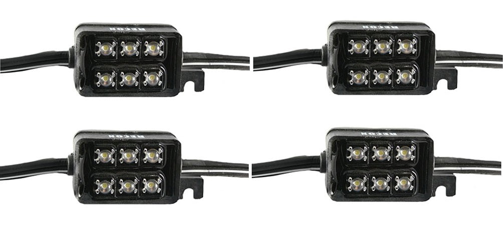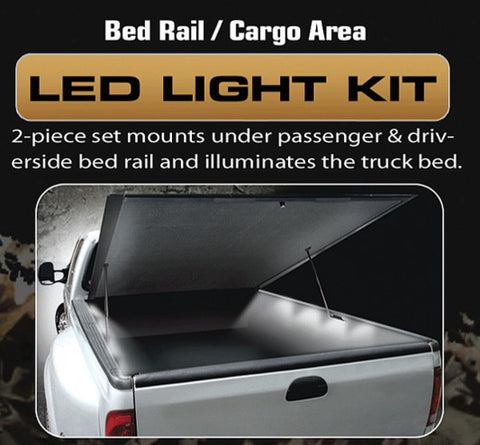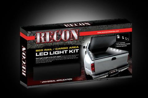 Don’t get caught in the dark again! RECON, the premier manufacturer of aftermarket lighting and accessories for the Truck and SUV market, is proud to announce their new RECON Cargo Area Truck Bed Rail Light Kit. This light kit consists of a set of 2 thick yet flexible strips that each contain 4 LED light boxes which each have six 1/4 watt LEDs. This provides a total of 48 white LEDs which are extremely bright & illuminate the farthest reaching section of your truck's bed cargo area. Whether you have a bed topper, a tonneau cover, or just want lots of extra light in your truck bed, THIS IS THE KIT FOR YOU. The RECON Cargo Area Truck Bed Rail Light Kit is completely weather-proof & mounts out of site underneath both bed rails & illuminates the truck bed from inside the cargo area. Gone are the days of using a flashlight to see what's inside your truck bed!