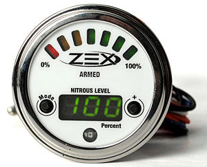 Other than removing the cylinder and weighing it, there has never been an easy way to monitor how full a nitrous bottle is. ZEX has remedied that problem by developing the industrys first Nitrous Level Gauge. This gauge displays how much nitrous is left in the bottle with both an illuminated LED indicator and a numerical fill percentage readout. It also accurately measures how much nitrous is being used. The ZEX Nitrous Level Gauge is compatible with any manufacturers nitrous system, and installs with an easy 5-wire hook-up. The gauge can monitor any commonly available nitrous cylinder from 1-30 lbs. and can monitor nitrous systems jetted up to 500 horsepower. The ZEX Nitrous Level Gauge features built-in automatic dimming for night use and is easily reset when refilling the nitrous bottle. An industry-first component; accurately monitors total nitrous system usage including purge. Compatible with any manufacturers nitrous system 5-Wire hook-up makes installation easy Fully configurable for any bottle size or nitrous shot Automatic dimming for night use The part number for this item is Zex 82395