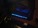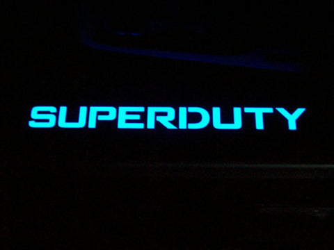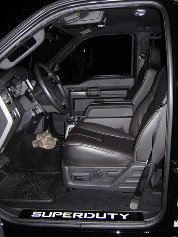 These Black Aluminum Door Sills by RECON are the perfect addition to your Super Duty truck. Featuring EL (electroluminescent) lighting, these kick plates will light up the word "Super Duty", just as you see in the photos above. By tapping into your vehicle's existing wiring, these kick plates will automatically light up when you open your door and then turn off as soon as you close the door. The part number for this item is 264121FDBK and it fits 1999-2016 Ford SuperDuty F250 F350 F450 models. The price is for a PAIR. 1 for the front driver and 1 for the front passenger door. These will only fit the front doors. They will not fit the rear doors.