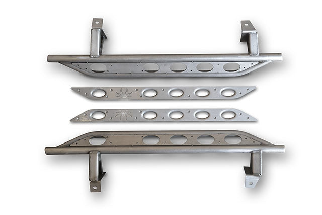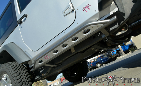 2007-2016 Jeep Wrangler (2 Door Models) Frame Mounted Rocker Knockers Rocker Armor by Poison Spyder Customs The most vulnerable areas on the body of the Jeep JK are the rocker panels. Poison Spyder Rocker Knockers protect your JK's rocker panel area while enabling you to slide over rocks and obstacles. Rocker Knockers enhance your Jeep's trail performance while adding rugged off-road looks to your JK. These Frame-Mounted Rocker Knockers are identical to our Body-Mounted version, except in how they mount. Which one is best for you will depend on how you intend to use your Jeep! DOM Tube Construction The tubular rocker rail is rugged 1.75" X .120 wall DOM structural tubing. The slider rail is fabricated from CNC-bent 1.5" X .120 wall DOM tubing. The space between the Slider and the main tube of the Rocker Knocker is filled with a 3/16" thick CNC laser-cut steel base plate for the removable slider skid. The slider and skid mount at an angle to the main tube of the Rocker Knocker to provide boatside-like protection from the rocks while keeping the Jeep's doors and body a safe distance from higher level trail hazards. Removable Slider Skid The removable slider skid features Poison Spyder's exclusive oval dimples for structural strength as well as great Poison Spyder looks. The Skid attaches with countersunk stainless steel flat head cap screws for a flush surface. The outer skid is made of 1/8" steel and is secured to a 3/16" base plate welded into the slider hoop assembly. The Slider does not rely on the skid for structure. The advantage of having the ability to remove the skid, is to allow you to replace it if it becomes damaged to a level that it has lost its aesthetic appearance or functionality. Also you will be able to customize the Slider's color to match your Jeep's body color, or any color you choose. Frame-Mounted Outriggers Frame-Mounted Rocker Knockers attach to your Jeep's frame rails through three rugged, precision engineered outriggers on each side. The outriggers are fabricated of CNC laser cut 3/16" thick plate steel, and are designed in a triangular shape to act as their own gusset and provide superior strength. The outrigger wraps around the bottom and side of the frame rail for support on two planes. The outriggers are also located so they may be directly bolted to the sides of the Jeep's body mounts for even more strength. Compare this design to competitors' frame-mounted sliders that use a simple piece of non-triangulated, non-gusseted tubing welded to a plate that attaches to the side of the Jeep's frame rail. Bolt-On or Weld-On installation Instructions and hardware are provided for a fairly easy bolt-on installation of the Frame-Mounted Rocker Knockers. The procedure uses some existing mounting holes on your Jeep's frame, but does require some additional drilling and tapping. Alternatively, installers may choose to weld the Rocker Knockers in place. Please note, however, that reaching the nuts on the back-side of the slider plate for installation of the removable skid will be more difficult with the Rocker Knockers already in place. We recommend testing the skid removal process with the Rocker Knockers bolted into place, before permanently welding them on. Suspension & Body Lift Compatibility Frame-Mounted JK Rocker Knockers are not compatible with typical "long arm" suspension kits, without some Do-It-Yourself modifications. The rearward support outrigger will likely interfere with the location of most long-arm kit's link brackets. The part number for this item is Poison Spyder 17-08-030 and it fits 2007-2016 Jeep Wrangler (2 Door Models).