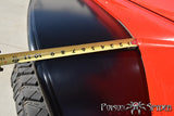 2007-2016 Jeep Wrangler Front Aluminum Crusher Flares (Extra Wide) by Poison Spyder Customs The Jeep JK's thin sheetmetal fenders and stock plastic flares are among the most vulnerable body components when traversing the trail. Measuring in at an extra wide 10 3/4" wide (vs 8 3/4" on the standard width), The Poison Spyder JK Front Crusher Flare kit improves both the aesthetics and durability of your Jeep during your off road adventures. Poison Spyder Standard Width JK Crusher Flares provide tire coverage similar to the factory flares, with the added advantage of a better approach angle and outer tire clearance. Aluminum Crusher Flares are the perfect balance between strength and light weight, at less than half the weight of the steel Crusher Flares This product ships as bare aluminumit will need to be painted or powder coated prior to final installation. Construction Aluminum JK Crusher Flares are constructed using 1.5" X .188" wall annealed aluminum structural tubing as the outer "rub rail". This .188" wall tubing is thicker than the .120" wall tubing used in our steel Crusher Flares, to provide better resistance to crushing, kinking, and bending than competitors' aluminum flares made with .120" wall aluminum tubing. The foundation of the Crusher Flare is a CNC laser cut, 3/16" thick aluminum mounting plate, precision brake-formed to conform to the subtle curves of the JK's body panels. Mounting holes are countersunk for the use of flat-head stainless steel mounting hardware. The top plate is CNC laser cut 1/8" aluminum plate, which is hand formed around the curves of the Crusher Flare for a factory appearance that matches the JK's organic body lines better than any other aftermarket metal flare available. NOTE: Aluminum JK Crusher Flares DO NOT include a laser-etched Spyder logo along the lower edge. JK Crusher Flare Inner BraceExclusive Inner Brace Set Every set of Poison Spyder JK Crusher Flares comes with a set of inner braces that tie the Crusher Flare in to the sturdier, heavier-gauge steel of the JK's inner body tub structure. Competitors' JK Flare products simply bolt directly to the outer layer of the JK's body sheetmetal. But as any JK owner knows, the exterior sheetmetal is very thin and flexible. Simply bolting a heavy duty fender directly to the exterior sheetmetal without the inner bracing is a disaster waiting to happen. Regardless of how sturdy the flare is built, upon contact with rocks, trees, etc., it will simply push in and deform the flimsy sheetmetal it is bolted to, possibly causing expensive and unsightly damage. The Inner Brace Set that comes with Poison Spyder Crusher Flares effectively bypasses the outer sheetmetal, instead transferring those forces to the much stronger inner structure of the Jeep. That's why we've been able to demonstrate the strength of our flare attachment system by parking another Jeep on top of the Crusher Flare! These Inner Braces are CNC laser cut, brake-formed for a great fit and simple installation. Rubber Liners Included JK Front Crusher Flares come with high quality rubber liners to place between the Crusher Flare and the Jeep's body sheetmetal during installation. The rubber liners provide help protect your Jeep's exterior paint, where the flare contacts it. It also helps even out the contact area of the Crusher Flare, absorbing any small bumps or imperfections between the mated surfaces. The rubber liner also helps keep moisture, dirt and debris from collecting between the Crusher Flare and the Jeep's body. These liners are cut from premium EPDM rubber. Retain Factory Wheel Wells When installing Poison Spyder JK Front Crusher Flares you have the option of retaining the factory wheel well liner to protect the engine from trail and road debris. Retaining the wheel well also helps to conceal the Inner Braces to complete a clean and finished appearance. Some trimming of the plastic wheel well is required, but the kit comes with hardware and mounting brackets to re-install the trimmed wheel well. Provisions for LED Marker Lamps The JK Front Crusher Flare kit comes standard with mounting provisions to replace the factory side marker with a high intensity 3/4" round LED marker light. The addition of the LED provides a more modern and refined look that complements the function and style of the Crusher Flare. The part number for this item is Poison Spyder 17-03-033-ALUM and it fits 2007-2016 Jeep Wrangler models.
