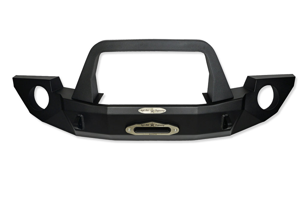 This bumper from Rock Slide Engineering is just what you need to give your ride a more aggressive look and feel. Made from tough textured black powder coated steel in the USA, the Rigid Front Bumper features the following extra features: Bull Bar, Winch Opening, integrated winch plate, Recovery Points, 6" light pockets .
