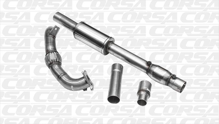 CORSA Performance Exhausts are known for their quality and technology. Corsa Performance Exhausts are more than a pipe with a muffler. Each bend is meticulously analyzed and tested for both power and sound. Corsa downpipes are no different and are built with improved sound and performance in mind. The integrated high flow cat is designed for increased power as well.
