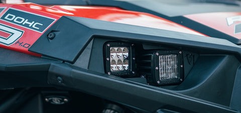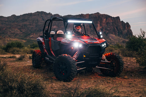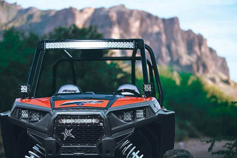 If you're looking to take the lighting on your RZR1000 Polaris to the next level, you're going to want this LED Headlight Kit from Rigid Industries. This complete kit comes with everything you're going to need to light up the night in a big way: 4 Rigid Industries High Output LED Lights (2 are SAE / DOT Compliant Lights, the other 2 are D Series Dually Lights), Custom RZR1000 specific powder coated black stainless steel mounting brackets, mounting hardware, and plug and play wiring harnesses. This kit not only looks the part, it also lives up to the hype in a big way. The light output is a blinding six times the factory headlight output. The part number for this LED Headlight Kit is Rigid Industries 46560 and it fits 2014-2017 Polaris RZR1000 models.