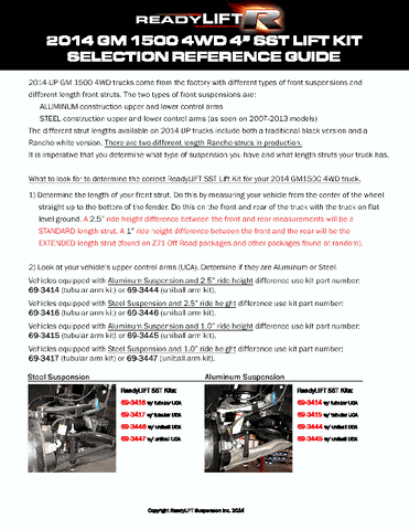 IMPORTANT: This Kit ONLY Fits 2014-2018 Chevy Silverado, GMC Sierra 1500 4WD that have factory CAST STEEL control arms AND a 2.5" front to rear ride height difference. If you have a 1" ride height difference, this kit will NOT fit. This kit does NOT fit AWD Denali Models. The tech bulletin above can be referenced if you're not sure about your setup. If you've been looking to put an aggressive on your 2014-2018 Chevy Silverado, GMC Sierra 1500 4WD (Does NOT fit AWD Denali) you've just found the perfect solution. The ReadyLift 69-3416 kit is a complete lift kit for your truck that comes with everything you need to not only lift your truck up, but more importantly maintain factory ride quality and safety. The ReadyLift 69-3416 kit comes with 2 forged 4" SST Strut Extensions and strong tube steel upper control arms. The 69-3416 kit also includes CNC-machined differential drop spacers, which 4WD models will need. These drop spacers lower the differential and correct the front CV axles back to a safe factory angle. These are included at no extra charge. The rear of the truck is lifted 1.75" by replacing the oem 1.25" blocks with 3" cast iron oem style lift blocks and elongated coated u-bolts. Shock extension brackets are included for the rear to keep shock travel within specs. The part number for this Ready Lift lift kit is 69-3416 and it fits 2014-2018 Chevy Silverado, GMC Sierra 1500 4WD (Does NOT fit AWD Denali) You will achieve 4" of front lift and 1.75" of rear lift when installing this kit. You can use up to a 33" wheel/tire combo without any rubbing when you install this lift.