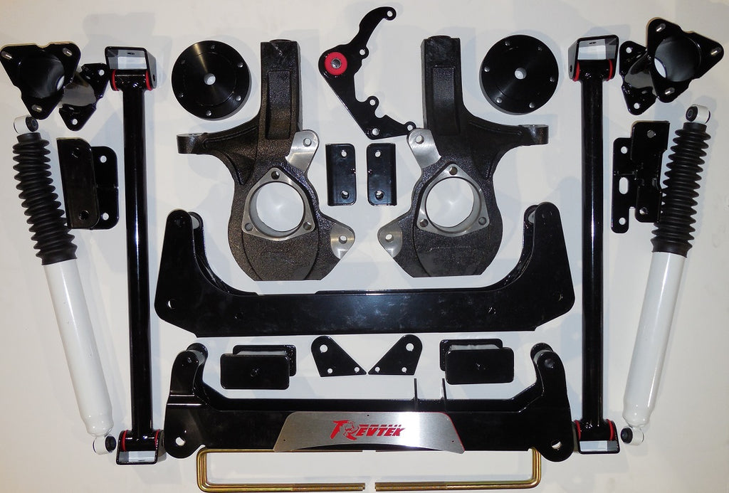 If you're looking for a complete lift to give your truck a more aggressive look or fit larger wheels and tires, you've come to the right place! RevTek Suspension's complete lift kits are an installer friendly solution that is affordable, reliable, and safe to use. Proudly made in the USA, this RevTek Suspension complete lift kit achieves 7" of lift for the front of your truck with a combination of lift spindles and strut spacers . new crossmembers are also included. You'll maintain your OEM steering geometry for a factory like ride and to avoid any traction control/stabilitrak issues. The rear of the truck is lifted with 5" lift blocks. New rear crossmember supports are also included. The rear is lifted less so that the truck is also leveled out since the Chevy and GMC sit lower in the front from the factory. Your RevTek Suspension complete lift kit will come with everything you need. RevTek Performance Shocks are included for the rear! All necessary hardware, as well as detailed instructions that include photos are included. The part number for this RevTek complete lift kit is 317 and it fits 2014-2017 Chevy Silverado and GMC Sierra 1500 Models. It lifts the front of your truck 7" , and the rear of your truck 5".