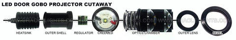 GOBO Projectors are installed by making a small hole in the bottom of each door (the cutting tool/drill bit is included) and then the projector is wired up into the inside of the door to get power.