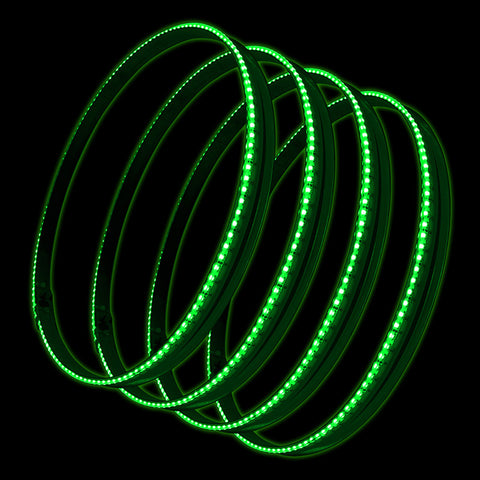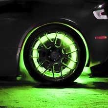 LED Wheel Light Rings (Set of 4) by Oracle are a great way to grab attention to those nice wheels you put on your vehicle! Also referred to as LED Rim Lights by some, Oracle LED Wheel Lights mount on the back of your brake assembly around the brake rotor dust shield. These fit on vehicles with up to a 15" Rotor (most vehicles). The ring can be enlarged to fit up to a 17" Rotor for an additional fee above. Most small cars can easily use the standard size and will have room to spare. To be safe you can measure your brake rotor from edge to edge. Oracle Wheel kits are exterior rated for both heat and water and will last under the stress of being in your wheel well unlike some of the cheap alternatives. Their universal design allows them to fit on virtually any vehicle. All required mounting hardware (including a switch) and instructions are included in the kit. Sold as a complete set of 4 pieces one kit is enough to do your entire vehicle. Available in several colors (choose above) as well as a color changing kit with a remote control (Extra Charge). The diameter of each ring is 15.5" (can be enlarged to 17.5" above for an additional charge) The part number for these Oracle GREEN Wheel Lights is 4215-004