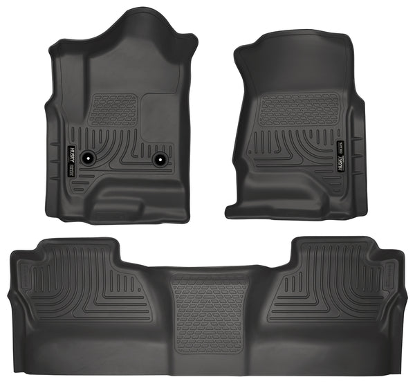 If youre looking for a set of Floor Liners or Cargo Liners that are superior to the competition, youve come to the right place. Husky Floor Liners and Cargo Liners, made by Husky Liners, offer a superior fitment because they designed specifically for your vehicle. Because of this, Husky Molded Floor Liners and Cargo Liners fit better, look better, and offer superior performance. Youll get a set of liners that are durable enough to stand up to the elements. Husky's deep troughs will hold water, soda, dirt, mud, or whatever else you spill or step onto them. The raised perimeter around Husky floor mats contain spills and debris while the embossed ribbing keeps your feet elevated and out of the water, mud, and dirt. When it is time to clean your Husky Floor Mats, theyll easily rinse clean with a garden hose. Additionally, unlike universal all weather floor mats, Husky All Weather Floor Mats will install perfectly every time and with ease since they are vehicle specific. Husky Liners come complete with their Sta-Put mounting system that holds the floor liners in place and keep them from shifting. Because Husky Floor Mats are made from highly durable thermoplastic, they will stand up to the weather and any additional beating you put them through. Sold as a set that will cover both sides of the front AND Back Seats, your Husky Floor Liners are backed by a lifetime warranty. You can rest assured that theyll be hard at work for as long as you own your vehicle. The part number for this item is 98231(Black) 98232(Grey) or 98233(Tan) (depending on your color choice) and this PAIR of Front Floor Liners AND a Single Piece Back Seat Liner fits 2014-2015 Chevy Silverado 1500 / GMC Sierra Crew Cab 1500 Models.