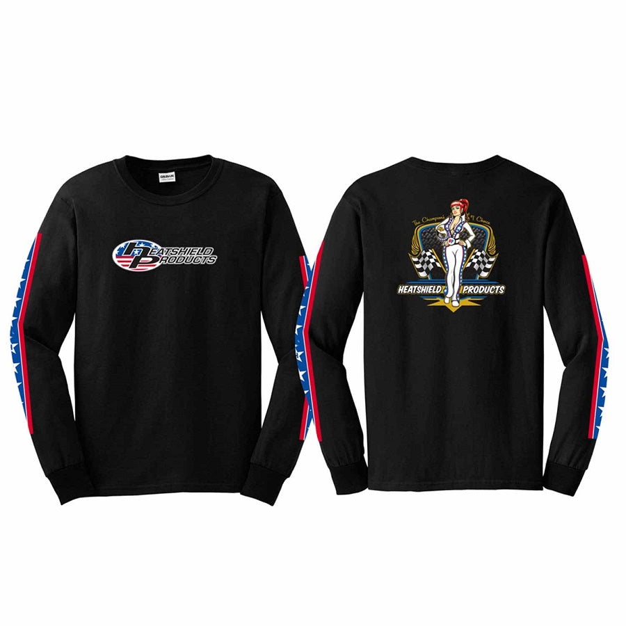 Special edition long sleeve Heatshield Products “Eve” T-shirt. We love our country and you do too. Patriotic Heatshield Products logo out front with our “Eve" daredevil pin-up girl on the back. These men's T-shirts are pre-shrunk cotton.