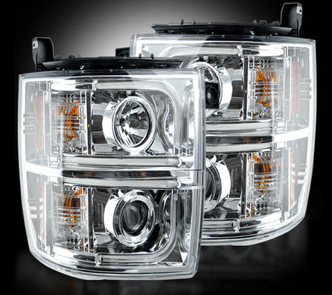 Featuring OLED Halos and Daytime Running Lights! Lets face it. Your factory headlights are plain, boring, and begging to be replaced. You see some of these new cars with brilliant looking projector headlights. You wonder why your truck came with the basic run of the mill headlights you ended up with. This is where RECON comes to the rescue. Recon Projector headlights will make your vehicle stand out from the crowd. RECONs Projector Headlights were designed by the engineers at RECON, who are truck enthusiasts themselves. They know what your factory headlight assemblies are lacking, and theyve come up with unique solutions that give a luxuriously sporty look, and set your vehicle apart from the rest of the pack. RECON Projector Headlights are 50 state street legal and manufactured to the highest standards, meaning that you wont be sacrificing durability or functionality when running your RECON Projection Headlights. The part number for these RECON Projector Headlights is 264275clc and they fit 2014-2017 Chevy Silverado 1500 models.