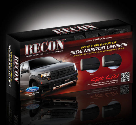 Recon Side Mirror Lenses replace the boring side mirror lens that the factory put on your side view mirrors. You'll go from the oem plain lens to a stylish custom look in minutes. Available in both clear and smoked finishes, we've got the look you want. Recon LED Side mirror lenses install in minutes with no automotive knowledge. The part number for this item is 264240BK and it fits 2009-2014 Ford F-150 (Including Raptor) Trucks.