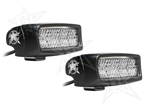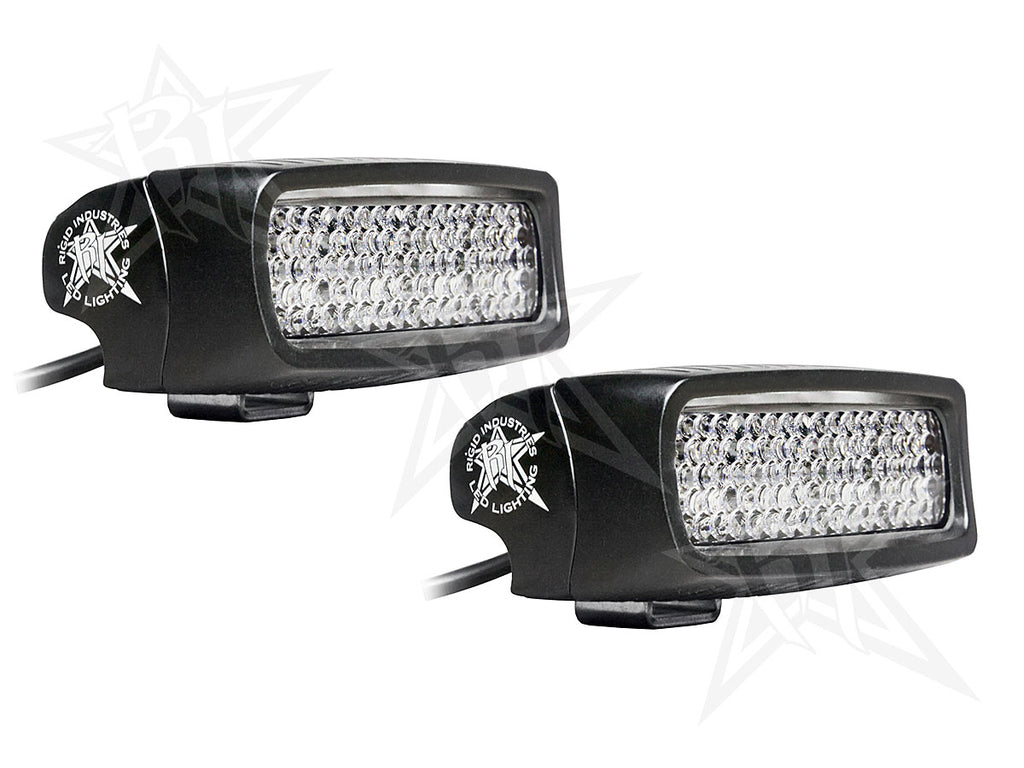 The SR-M Surface Mount Back Up Light Kit by Rigid Industries includes everything you need to install a pair of Rigid Industries back-up lights on your vehicle: Two Rigid Industries LED lights, a 25' wiring harness hardware and black covers. This kit features the Rigid patented Hybrid optics system combined with a Diffused lens to offer a powerful 60 degree beam pattern for unmatched visibility. The part number for this item is Rigid Industries 98002