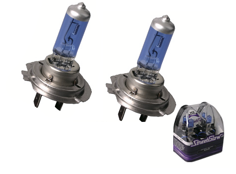 The StreetGlow Xenon-White Bulbs utilize a high pressure charge of Xenon gas, which has an excellent thermal efficiency. Standard halogen bulbs use a lower charge of Bromine gas, which is not as efficient. StreetGlow's use of Xenon gas increases the bulbs luminous flux by more than 20%, giving light which has a brilliant white quality, and far brighter than light produced by halogen bulbs of the same wattage.