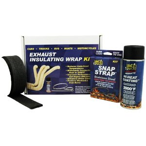 Thermo-Tec Exhaust / Header Wrap Kit - Complete Kit: Thermo-Tec came up with this kit to give customers the ability to buy a single part number and receive everything they need to wrap their exhaust system or headers. Each kit comes with a roll of 2" x 50' of header/exhaust wrap (Part 11022), one can of black high heat exhaust wrap spray coating (Part 12001), and a package of Snap Straps / Thermal Ties (Part 13150) to affix the exhaust wrap with. This kit contains enough exhaust wrap to complete most 4 cylinder or motorcycle applications. The part number for this item is 19122